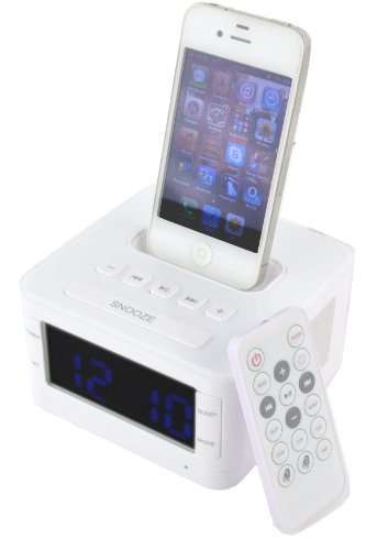 TTsims B7 Clock Radio Dock for iPod and iPhone 4S / 4 / 3GS / 3G with Remote Control - White - Stereo alarm clock radio and docking station with charging function - PLL FM Radio with 10 station storage - Remote Control - Snooze/Sleep functions - Dual alarms and choose to wake up to iPod/iPhone, radio or buzzer - Backlit LCD for clock and menu functions, with 5 dimming levels - Extra button-shape battery for clock backup - Universal iPod docking stations, compatible with any iPod with dock connector, including iPhone - 3.5mm stereo line-in cable (included) for playing other audio devices,